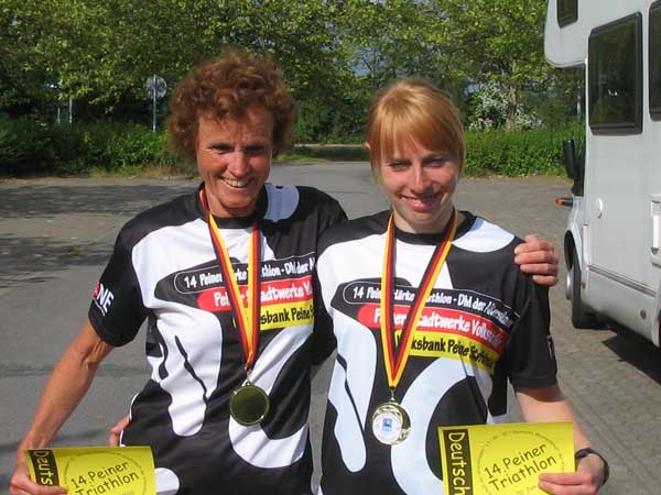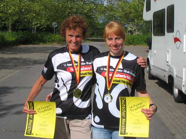Nicole und Margit Bartsch 1. Platz Deutsche Meisterschaft Triathlon in der Altersklasse TW 20 bzw. TW 55 Zum 6. Mal in Peine/NDS ausgetragen ; nun schon traditionell ein begnadet liebevoll organisierter Wettkampf, bei dem die Ausrichter der Tri-Speedys ein gefühlvolles Händchen für den Sport, für den Sportler und das ganze Drumherum haben. Während die Nacht vor Ort mit 11 °C recht kühl und regnerisch verlief, zeigte sich der Tag des Wettkampfes (Sonntag, 20.6.2010) sonnig und mit angenehmen Temperaturen. Leichter Wind. Tagsüber zogen dichte Wolkenfelder über das Gebiet ; Regen fiel aber nicht. Der „Eixer See“ erlaubte mit <19°C das Schwimmen im Neopren-Anzug. Margit ging mit etwa 100 Startern aus verschiedenen Altersklassen um 10:00 Uhr als erste ins Rennen, fand gleich einen guten Kraul-Rhythmus und konnte die 1.500 m Schwimmen in 24:41 min beenden, kletterte als erste Frau aus dem Wasser und ging mit einem beruhigenden Vorsprung auf die Radstrecke : Das Ziel „Titelverteidigung“ wurde in Angriff genommen. Doch hinter ihr fuhr Ulla Floer aus Bielefeld ein rasantes Rennen. Nachdem diese beim Schwimmen fast 2 min verloren hatte, nahm sie schon nach einer Rad-Runde von 20 km Sicht-Kontakt zu Margit auf und überholte sie bei km 30 von 40, ohne daß Margit folgen konnte. Doch schon in der Wechselzone zum Laufen zeigte sich, dass Margits Laufklasse der entscheidende Trumpf war : Schon nach wenigen Metern war sie auf ihre Konkurrentin Ulla aufgelaufen und taktierte nicht lange : Auf dem flachen Kurs, der vorwiegend über Schotterwege führte, nutze sie den einzigen langen, kaum merklichen Anstieg, um erneut die Führung zu übernehmen. Diese wurde bis ins Ziel kontinuierlich ausgebaut. Mit 2:26:51 finishte sie in einer Zeit, die auch in der Altersklasse darunter (TW 50) zum Deutschen-Meister-Titel gereicht hätte. 2. Platz Ulla Floer ; Bielefeld ; 2:29:28 3. Platz Christiane Göttner ; Fürstenfeldbruck ; 2:39:40 Im Feld auch Heike Kaack in der TW 50, die fast 15 Konkurrentinnen in ihrer Altersklasse zählte und nach dem Schwimmen in Führung lag. Leider hat ihre bekannte Schwäche auf dem Rad dazu geführt, dass sie peu à peu durchgereicht wurde. Platz 7 in 2:38:57 war dennoch aller Ehren wert. Nicole Bartsch absolvierte trotz ihrer großen Triathlon-Erfahrung (betreibt diesen Sport seit der Grundschule) ihren ersten (!) Wettkampf über die Olympische Distanz und konnte nicht genau einschätzen, wie es gehen würde. – Nach dem Schwimmen stieg sie als Führende nach 22:31 min aus dem Wasser, hatte aber mit Sabrina Mohr (Radsport-Zentrum Hamburg) eine ernst zu nehmende Athletin nur 14 Sekunden hinter sich. Nach einer Rad-Runde war dieser Vorsprung geblieben ; doch nach der zweiten aufgebraucht ! Sabrina ging als erste in die Wechselzone zum Laufen ; Nicole in Sichtkontakt dahinter ; am Beginn der Laufstrecke erneuter Führungswechsel : Nicole vor Sabrina. Beide kannten sich aus Wettkämpfen aus der Jugendzeit. Wie würde es ausgehen ? – Aber am o.g. Anstieg, wo ihre Mutter die Konkurrenz demontierte, zeigte sich die Tochter von ähnlichem Charakter : Ihrer Tempo-Beschleunigung konnte niemand folgen und sie lief ihrem ersten Titel „Deutsche Meisterin“ entgegen : Endzeit 2:15:51 ; Sabrina Mohr 2:19:13 Ruth Pohlmann, für TRIAS Flensburg einen Startpaß besitzend, aber immer noch Athletico-Mitglied, wurde Vize-Meisterin, nachdem sie vor Jahresfrist noch auf dem Treppchen ganz oben gestanden hatte. Zeit 2:15:02 Dirk Große (TM 40) erreichte mit Platz 27 von 51 in 2:21:21 eine Zeit, die Rückschlüsse auf einen guten Wettkampf erlaubte. Stephan Schuldt, Startpaß für Vfl Oldesloe, aber auch Athletico-Mitglied, finishte in der TM 25 in 2:19:14 Resultate : http://www.trispeedys.de/ergeb nis/tria10/Ergebnispeine2010DM .html |