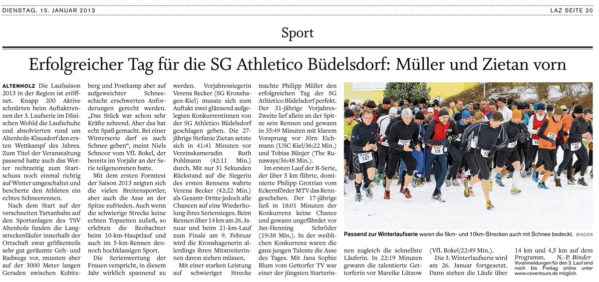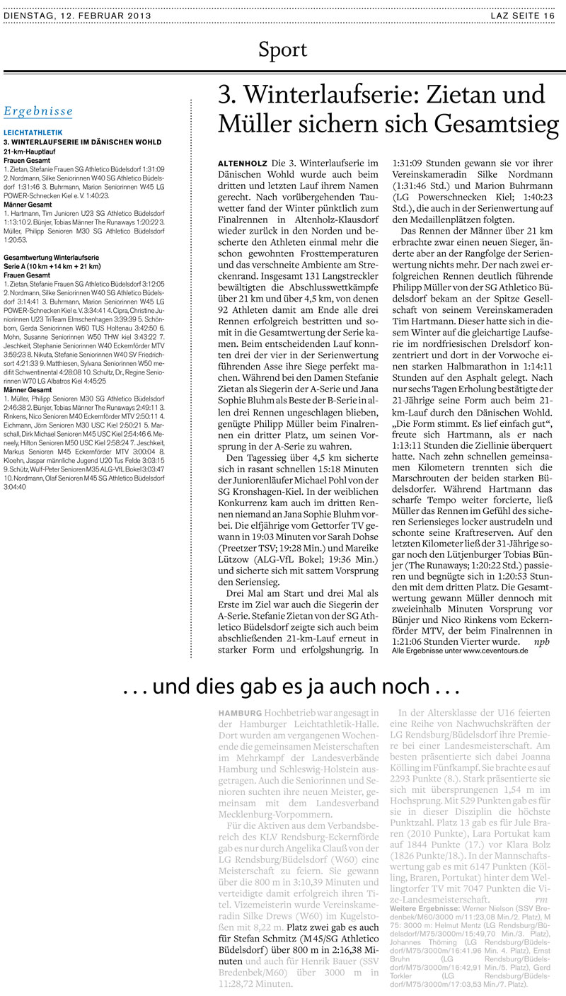 Und heute der Bericht in der Landeszeitung über die Winterlaufserie . . . sowie der Bericht über die Leichtathletik-Hallen-LM in Hamburg. |