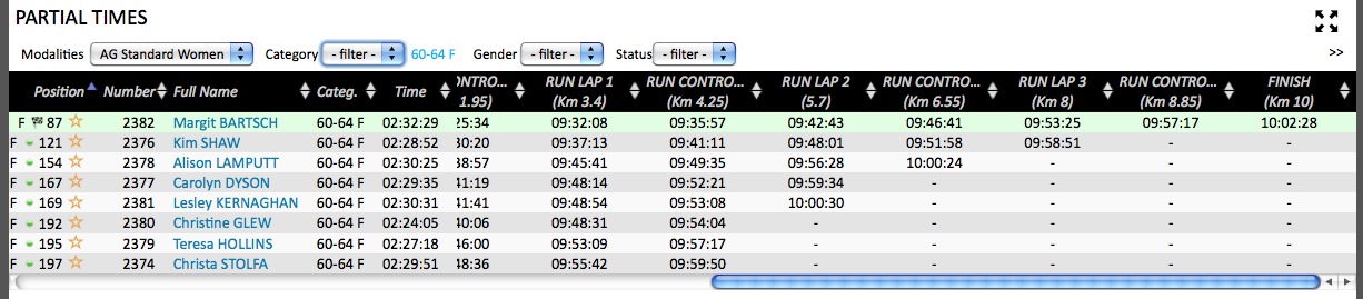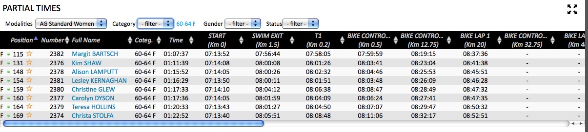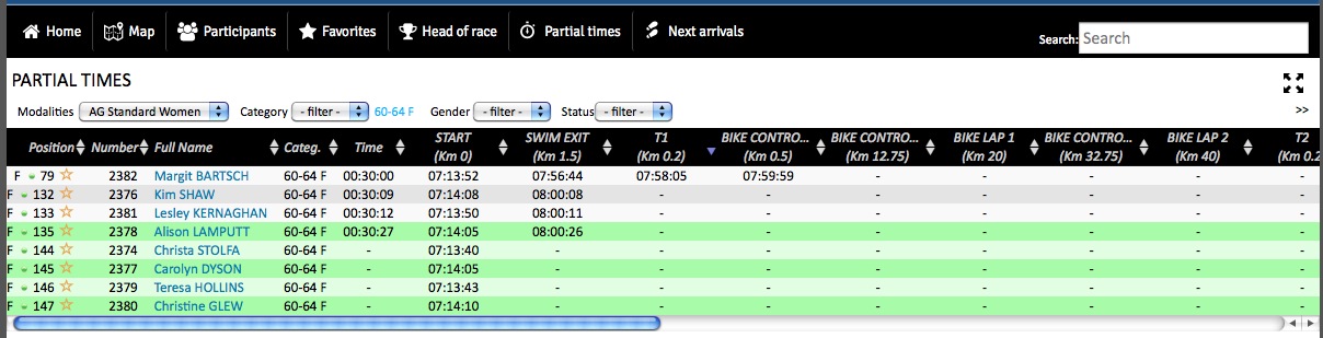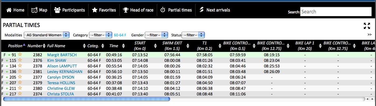 . . . ob sie sich erkannt haben: ![]() Mit Beverley Childs hat sie schon mal einen Wettkampf bestritten . . . und hier fahren sie Kopf an Kopf. Stand nach 20 Rad-km: ![]() 4 Minuten Vorsprung . . . |