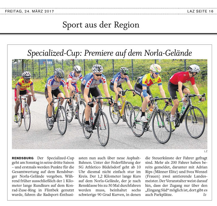 Das 1. SPECIALIZED-Cup-Rennen findet am Sonntag, den 26.03.2017 statt ; klick ... Infos zum Rundstreckenrennen Am Freitag, den 24.03.2017 werden wir ab 16:00 Uhr dort ein paar Runden drehen, um dann um 17:00 Uhr beim üblichen Treff in Westerrönfeld, Dorfstraße 8, aufzuschlagen. Wer zu dem angebotenen Trainings-Termin nicht kann ... mit der Chefin der NORLA ist ausgehandelt, daß jederzeit das Gelände zum Beschnuppern des Kurses genutzt werden kann. Zumindest bis zum Rennen. Danach natürlich nicht mehr. |